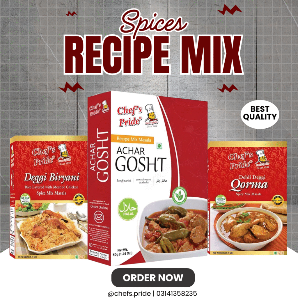 Today, Chef’s Pride is proudly exported to several countries worldwide, bringing the rich taste of Pakistan to international kitchens. Our name has become synonymous with purity, flavor, and uncompromised quality.
