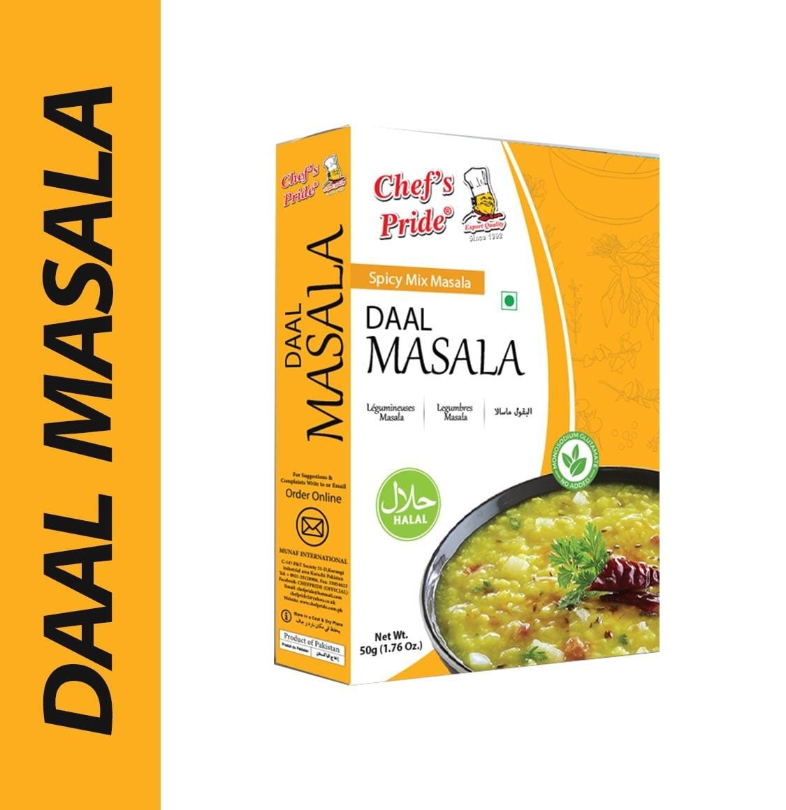 Chefpride Daal Masala is a flavorful blend of carefully selected spices designed to enhance the taste of all kinds of lentils. Whether you’re making masoor, moong, mash, or chana daal, this aromatic masala adds a rich, homestyle taste to every bowl. With the perfect balance of cumin, coriander, turmeric, red chili, and other traditional spices, your daal becomes instantly more delicious and heartwarming. Just a spoonful of Chefpride Daal Masala transforms ordinary lentils into a wholesome, satisfying dish, perfect with roti, rice, or naan.